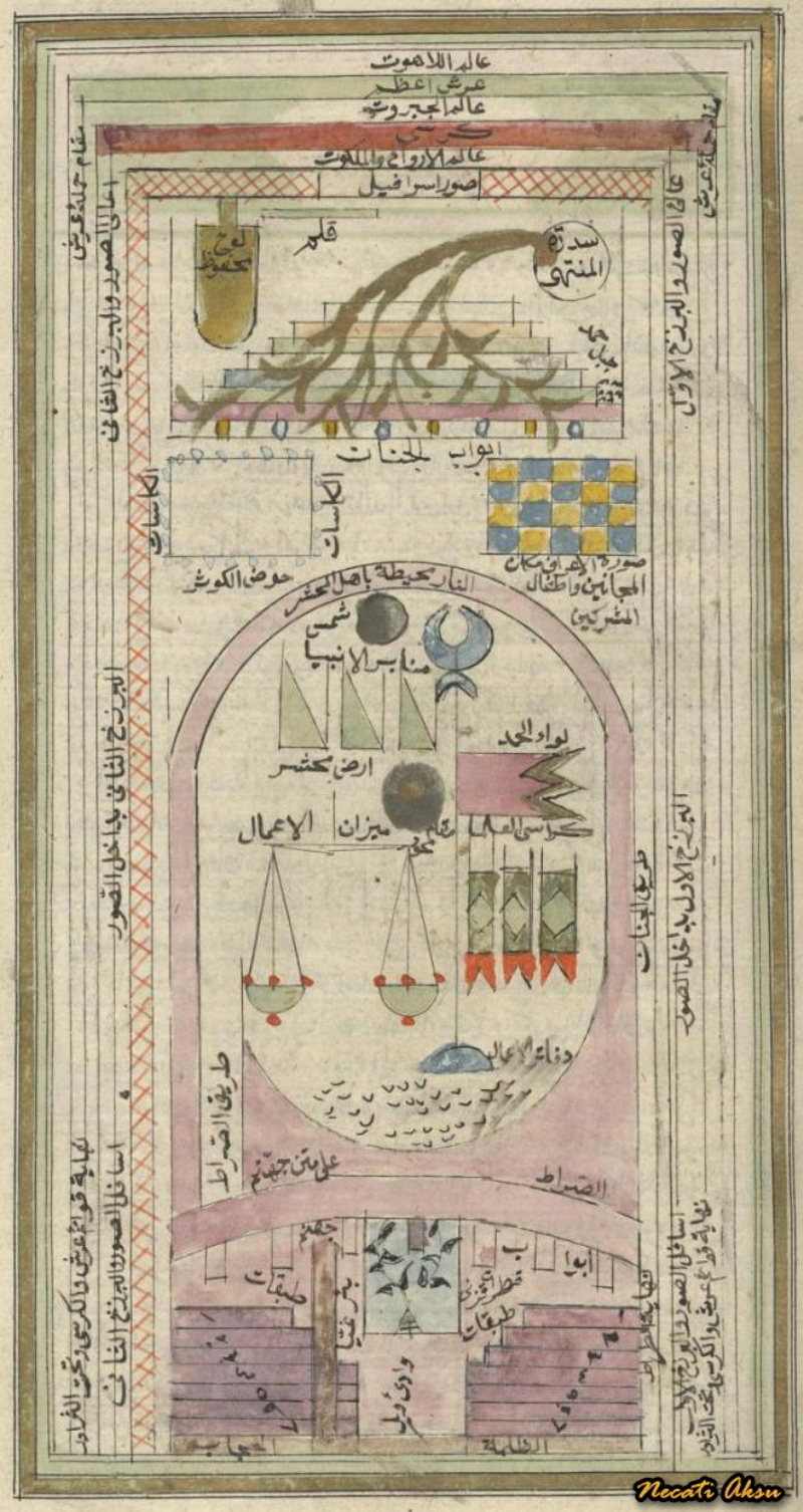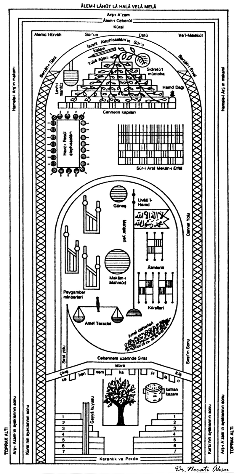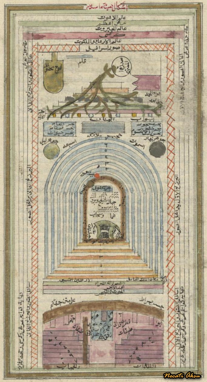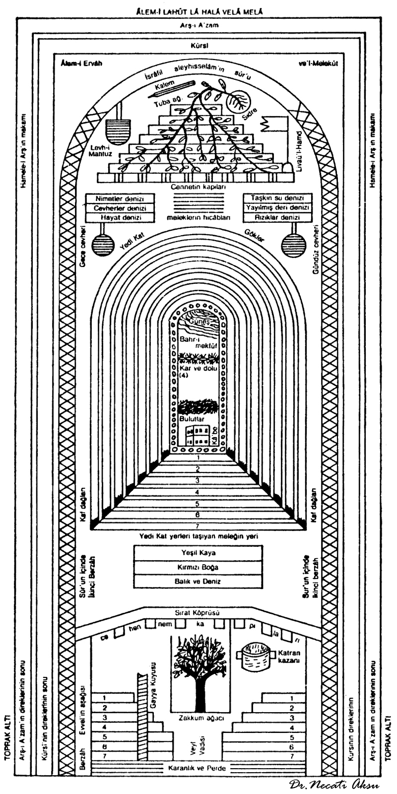 Yedi denizi, dağları, yerleri ve cehennemi özet olarak bildirir.