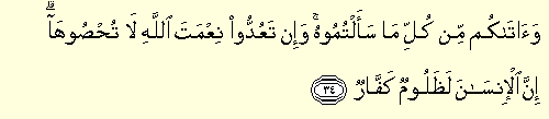 “Ve ataküm min külli ma seeltümuh ve in teudu ni'metellahi la tuhsuha innel insane le zalumün keffar: O size istediğiniz her şeyden verdi. Allah'ın nimetini sayacak olsanız sayamazsınız. Doğrusu insan çok zalim, çok nankördür!” (İbrâhim 14/34)