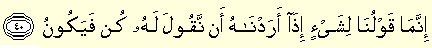 “İnnema kavlüna li şey'in iza eradnahü en nekule lehu kün fe yekun: Biz, bir şeyin olmasını istediğimiz zaman, ona (söyleyecek) sözümüz sadece «Ol!» dememizdir. Hemen oluverir.” (Nahl 16/40)