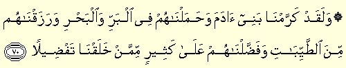 “Ve le kad kerramna beni ademe ve hamelnahüm fil berri vel bahri ve razaknahüm minet tayyibati ve faddalnahüm ala kesirim mimmen halakna tefdiyla: Biz, hakikaten insanoğlunu şan ve şeref sahibi kıldık. Onları, (çeşitli nakil vasıtaları ile) karada ve denizde taşıdık; kendilerine güzel güzel rızıklar verdik; yine onları, yarattıklarımızın birçoğundan cidden üstün kıldık.” (İsrâ 17/70)