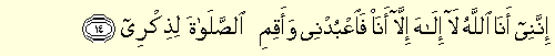 “İnneni enallahü la ilahe illa ene fa'büdni ve ekimis salate li zikri: Muhakkak ki ben, yalnızca ben Allah'ım. Benden başka ilâh yoktur. Bana kulluk et; beni anmak için namaz kıl. “ ( Tâ Hâ 20/14)