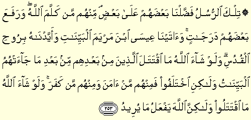 “Tilker rusülü faddalna ba'dahüm ala ba'd, minhüm men kellemellahe ve rafea ba'dahüm deracat, ve ateyna iysebne meryemel beyyinati ve eyyednahü bi ruhil kudüs, ve lev şaellahü maktetelellezine mim ba'dihim mim ba'di ma caethümül beyyinatü ve lakiniltelefu fe minhüm men amene ve minhüm men kefar, ve lev şaellahü maktetelu ve lakinnellahe yef'alü ma yürid: O peygamberlerin bir kısmını diğerlerinden üstün kıldık. Allah onlardan bir kısmı ile konuşmuş, bazılarını da derece derece yükseltmiştir. Meryem oğlu İsa'ya açık mucizeler verdik ve onu Rûhu'l-Kudüs ile güçlendirdik. Allah dileseydi o peygamberlerden sonra gelen milletler, kendilerine açık deliller geldikten sonra birbirleriyle savaşmazlardı. Fakat onlar ihtilafa düştüler de içlerinden kimi iman etti, kimi de inkâr etti. Allah dileseydi onlar savaşmazlardı; lâkin Allah dilediğini yapar.” (Bakara 2/253)