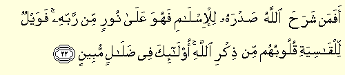 “E fe men şerahallahü sadrahu lil islami fe hüve ala murim mir rabbih fe veylül lil kasiyeti kulubühüm min zikrillah ülaike fi dalalim mübin: Allah kimin gönlünü İslâm'a açmışsa o, Rabbinden bir nûr üzerinde değil midir? Allah'ı anmak hususunda kalpleri katılaşmış olanlara yazıklar olsun! İşte bunlar apaçık bir sapıklık içindedirler.” (Zümer 39/22)