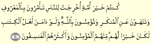 “Küntüm hayra ümmetin uhricet lin nasi te'mürune bil ma'rufi ve tenhevne anil münkeri ve tü'minune billah, ve lev amene ehlül kitabi le kane hayral lehüm, minhümül mü'minune ve ekseruhümül fasikun: Siz, insanların iyiliği için ortaya çıkarılmış en hayırlı ümmetsiniz; iyiliği emreder, kötülükten meneder ve Allah'a inanırsınız. Ehl-i kitap da inansaydı, elbet bu, kendileri için çok iyi olurdu. (Gerçi) içlerinde iman edenler var; (fakat) çoğu yoldan çıkmışlardır.” (Âl-i İmrân 3/110)
