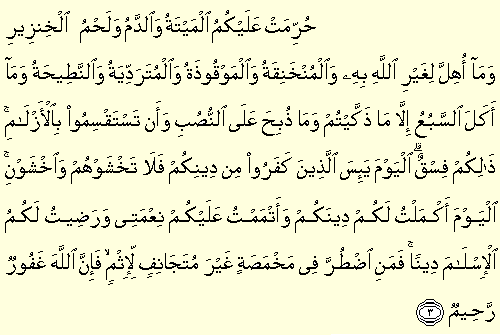 “Hurrimet aleykümül meytetü ved demü ve lahmül hinziri ve ma ühille li ğayrillahi bihi vel münhanikatü vel mevkuzetü vel müteraddiyetü ven netiyhatü ve ma ekeles sebüu illa ma zekkeytüm ve ma zübiha alen nüsubi ve en testaksimu bil ezlam zaliküm fisk elyevme yeissellezine keferu min diniküm fe la tahşevhüm vahşevn elyevme ekmeltü leküm dineküm ve etmentü aleyküm ni'meti ve radiytü lekümül islame dina fe menidturra fi mahmesatin ğayra mütecanifil li ismin fe innellahe ğafurur rahiym: Leş, kan, domuz eti, Allah'tan başkası adına boğazlanan, boğulmuş, (taş, ağaç vb. ile) vurulup öldürülmüş, yukarıdan yuvarlanıp ölmüş, boynuzlanıp ölmüş (hayvanlar ile) canavarların yediği hayvanlar -ölmeden yetişip kestikleriniz müstesna- dikili taşlar (putlar) üzerine boğazlanmış hayvanlar ve fal oklarıyle kısmet aramanız size haram kılındı. Bunlar yoldan çıkmaktır. Bugün kâfirler, sizin dininizden (onu yok etmekten) ümit kesmişlerdir. Artık onlardan korkmayın, benden korkun. Bugün size dininizi ikmal ettim, üzerinize nimetimi tamamladım ve sizin için din olarak İslâm'ı beğendim. Kim, gönülden günaha yönelmiş olmamak üzere açlık halinde dara düşerse (haram etlerden yiyebilir). Çünkü Allah çok bağışlayıcı ve esirgeyicidir.” (Mâide 5/3)