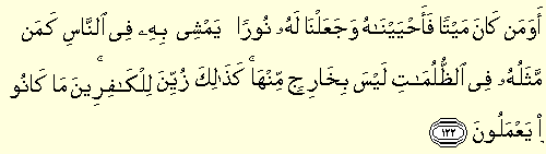 “E ve men kane meyten fe ahyeynahü ve cealna lehu nuray yemşi bihi fin nasi ke mem meselühu fiz zulümati leyse bi haricim minha kezalike züyyine lil kafirine ma kanu ya'melun : Ölü iken dirilttiğimiz ve kendisine insanlar arasında yürüyebileceği bir ışık verdiğimiz kimse, karanlıklar içinde kalıp ondan hiç çıkamayacak durumdaki kimse gibi olur mu? İşte kâfirlere yaptıkları böyle süslü gösterilmiştir.” (En’âm 6/122)