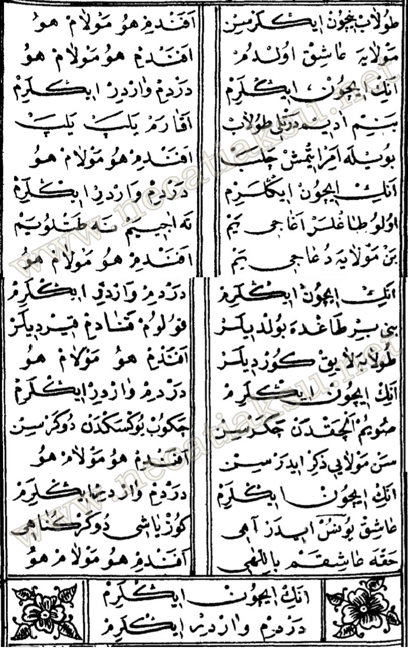 Benim adım dertli dolap, Suyum akar yalap yalap. Böyle emreylemiş Çalap, Derdim vardır inilerim.